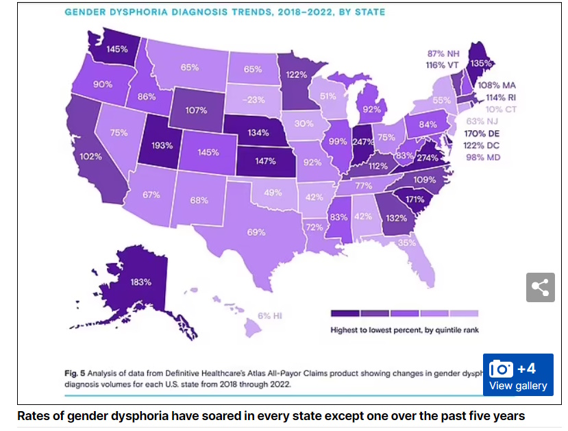 Rates of gender dysphoria, a clinical diagnosis by a healthcare professional that differs from gender non contentedness, have soared in every US state except one since 2018 - with the average age of diagnosis trending younger.