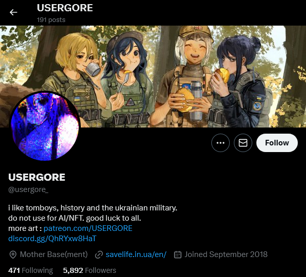 She lies about being in Ukraine when she lives in Poland. When asked about why her twitter is in polish, she says "she's learning it", just as much as she hides her real gender on the usergore account.