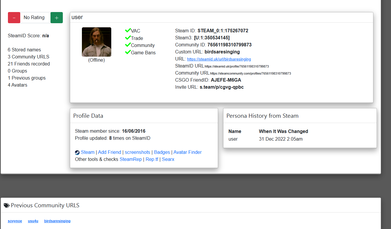 Naturally, I click on "his" profile. It's private? No problem! I slap it into SteamID and look for the past names, and there I open Pandora.