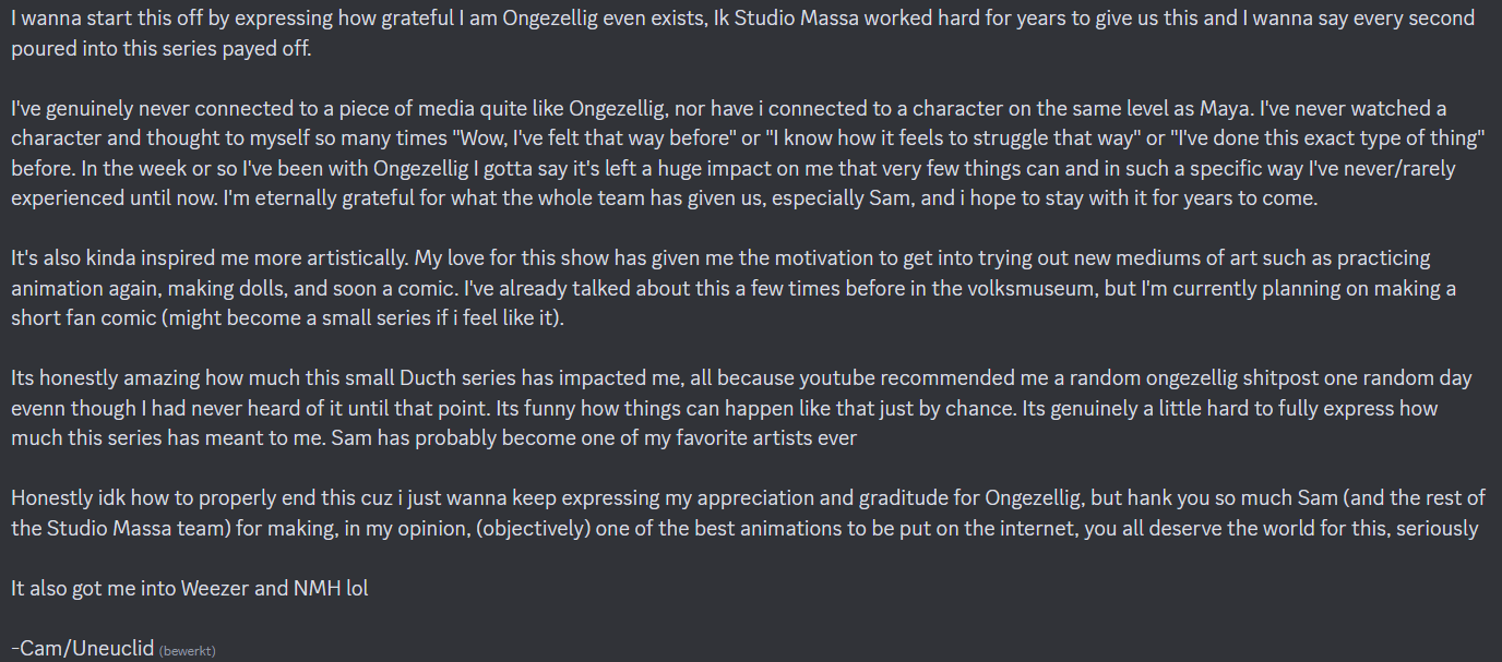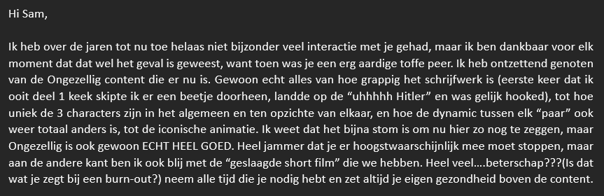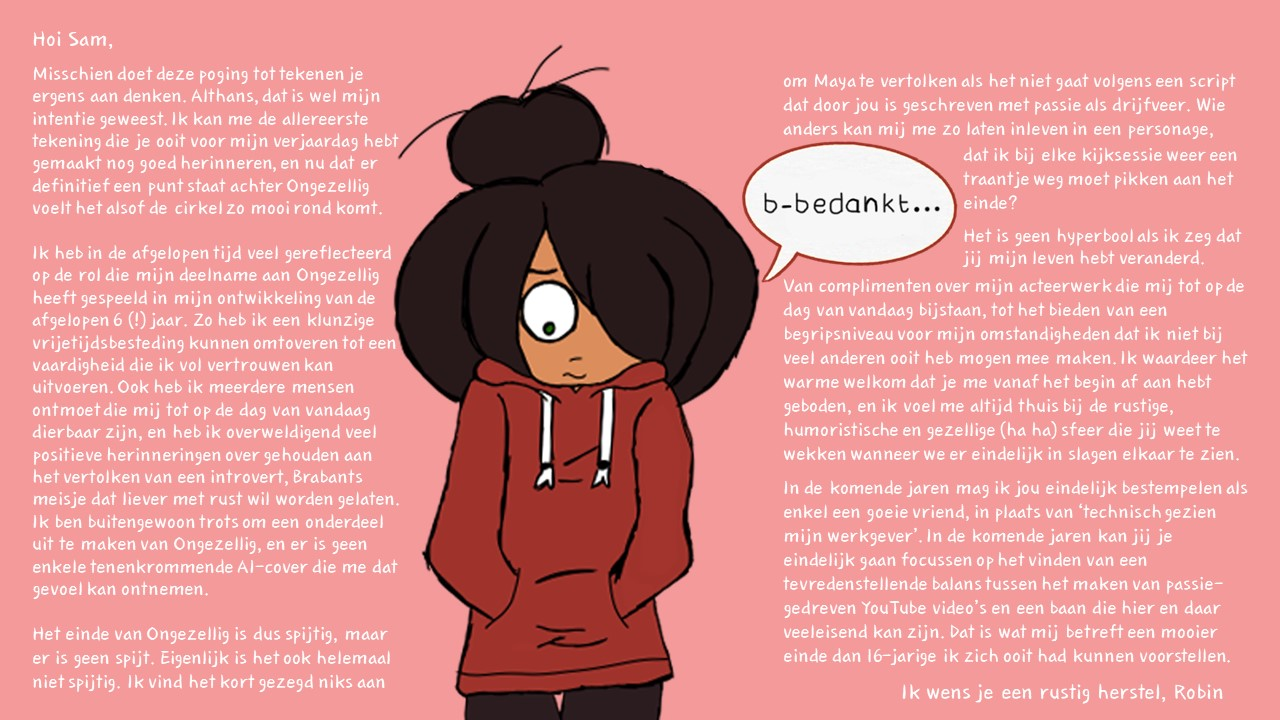 >3:20 Says he won’t continue Ongezellig as a comic because he thinks he’s very bad at comic making (poor bastard really thinks that lowly of himself). Thinks Maya’s Sweet 16 is the worst thing he’s ever made.