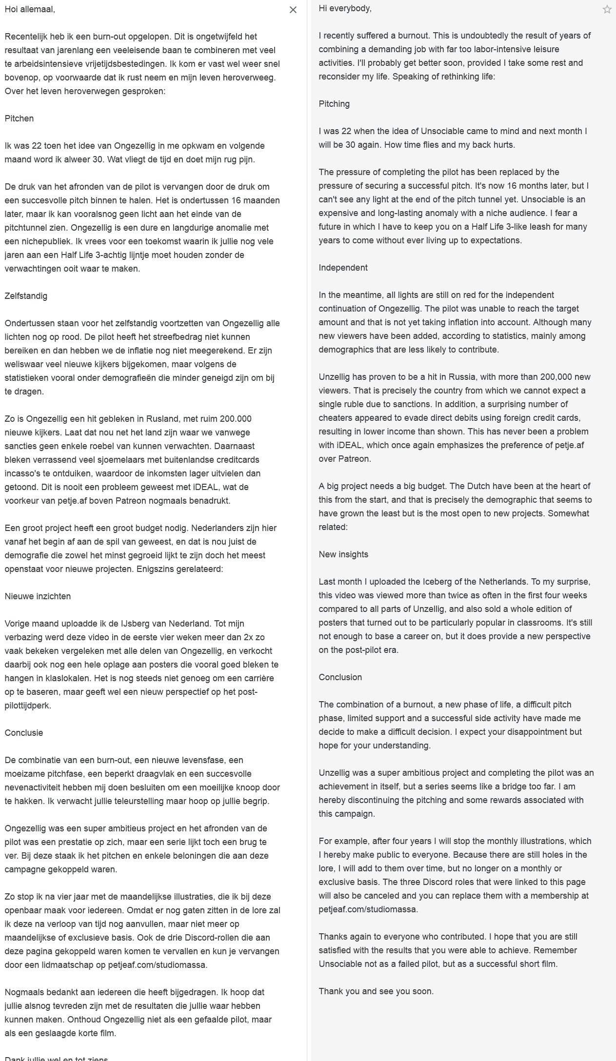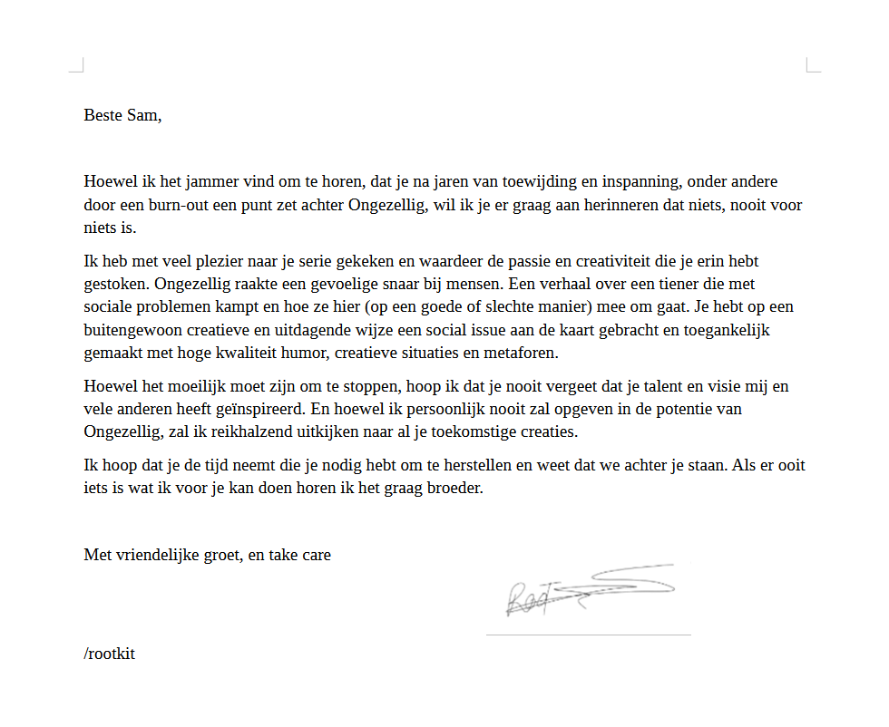 Ongezellig was a super ambitious project and completing the pilot was an achievement in itself, but a series seems like a bridge too far. I am hereby discontinuing the pitching and some rewards associated with this campaign.