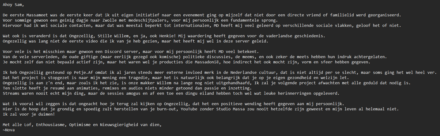 tl;dr is her thanking Massa for giving her the opportunity of VAing for a character and the time they spent working together.>Hi Sam,