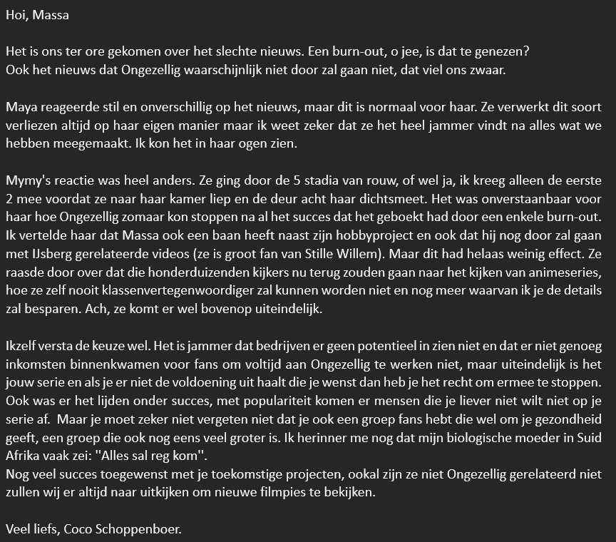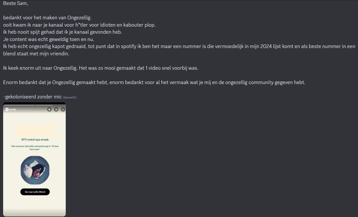 >I have recently reflected a lot on the role that my participation in Ongezellig has played in my development over the past 6 (!) years. This way I was able to transform a clumsy leisure activity into a Skill that I can perform with confidence. I also met several people who are dear to me to this day, and I have an overwhelming number of positive memories of portraying an introverted Brabant girl who prefers to be left alone. I am extremely proud to be a part of Ongezellig, and there isn't a single cringeworthy Al cover that can take that feeling away from me.