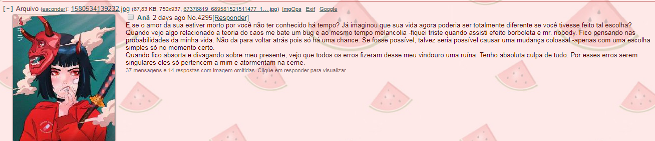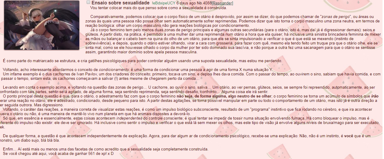 “Saudações, Lola. Me esforço para escrever isso, espero algum feedback nem que seja um vai pro inferno. Sou masculinista. Não um desses fundamentalistas religiosos que acham que deixar cabelo crescer é travestismo e ter chefa é manginismo. Apenas sou contra uma coisa: O sistema 'sexual' que predomina. Sendo justo: Não sou contra as mulheres só gostarem de cafajestes. Infelizmente, em toda minha vida sempre testemunhei isso, não só de meus olhos, mas de todos os meus amigos honrados. Tive colegas cafajestes, estes que me mais confirmavam que mulher gostava era de cafajeste.