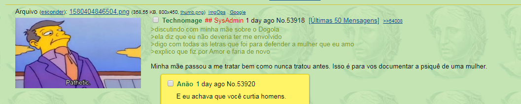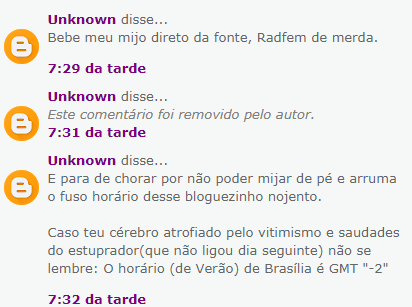 Porém não durou muito tempo essa paz pois tretaram nos comentários um ano depois:Esta deve ser a história mais incrível que já apareceu aqui no blog. Confesso que, há cerca de duas semanas, quando um troll bastante conhecido aqui no blog entrou em contato comigo, querendo comprar meu livro, e narrando sua trajetória, eu não acreditei. Pensei que fosse trollagem. Como que o Raphael, pra quem já "dediquei" este post aqui, podia ter mudado tanto em tão pouco tempo? O Raphael, aquele mascu que vivia se vangloriando de se castrar quimicamente, tomando remédios para não sentir mais desejo sexual e, assim, libertando-se das mulheres, essas megeras!
