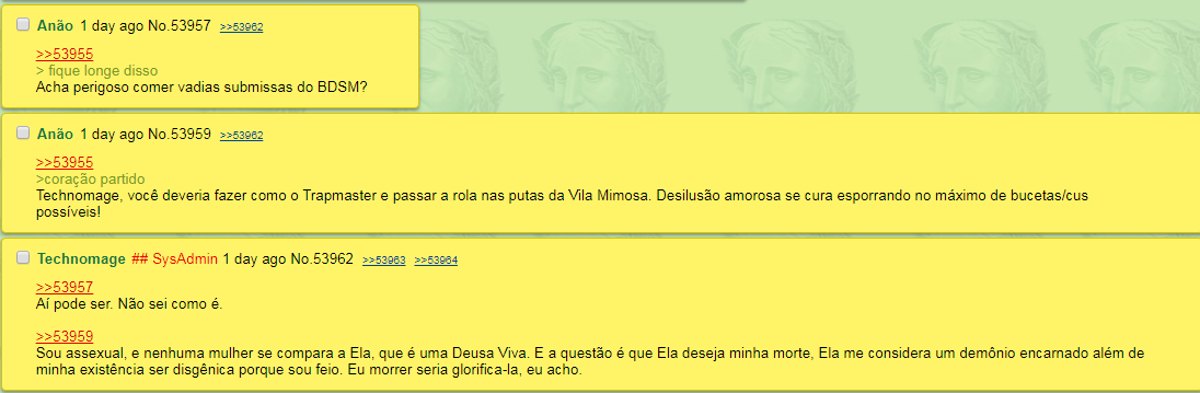 Após Technomage conhecer alguns membros da turminha de desajustados do Dogolachan, vira moderador do chan em 2016 não pela trollagem e sim por ser gado de uma attwhore (Julia Busse) que estaria trollando os dogoleiros Guerra e Kyo:(UPDATE em outubro de 2013: infelizmente, embora a história que segue seja verdadeira, Raziel continua sendo misógina. Deixou de ser homem, mas segue sendo mascu. É uma persona non grata neste blog. Aqui você entende o porquê. Ela escreveu depois de ser banida aqui do blog: