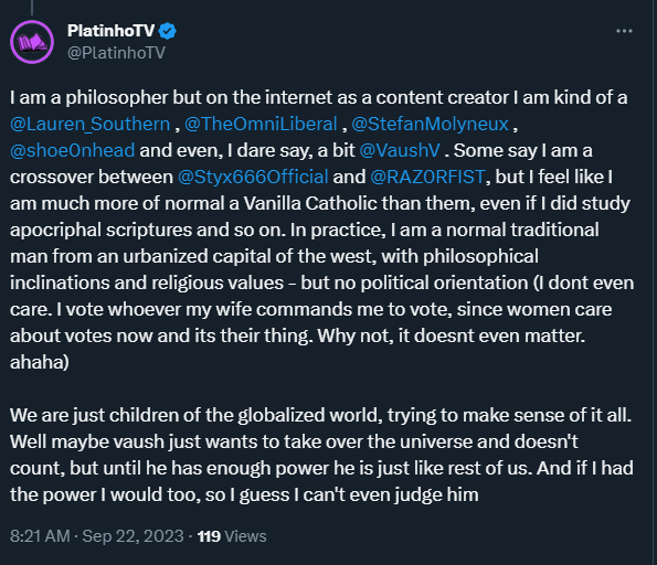 Platinho é um filósofo de youtube,baseado no filósofo grego Platão, promovendo o movimento MGTOW para um público mais mainstream associando os seus pensamentos e ideias a animes e filmes populares, ficou conhecido a tentar se aproximar do Olavismo e o movimento ancap, mas por causa de suas tentativas em tentar deixar o movimento MGTOW mainstream acabou sendo criticado inúmeras vezes por isso, ficando estressado por causa de outras pessoas desafiarem o seu pensamento,tentando passar um ar de superioridade e virando chacota no processo.