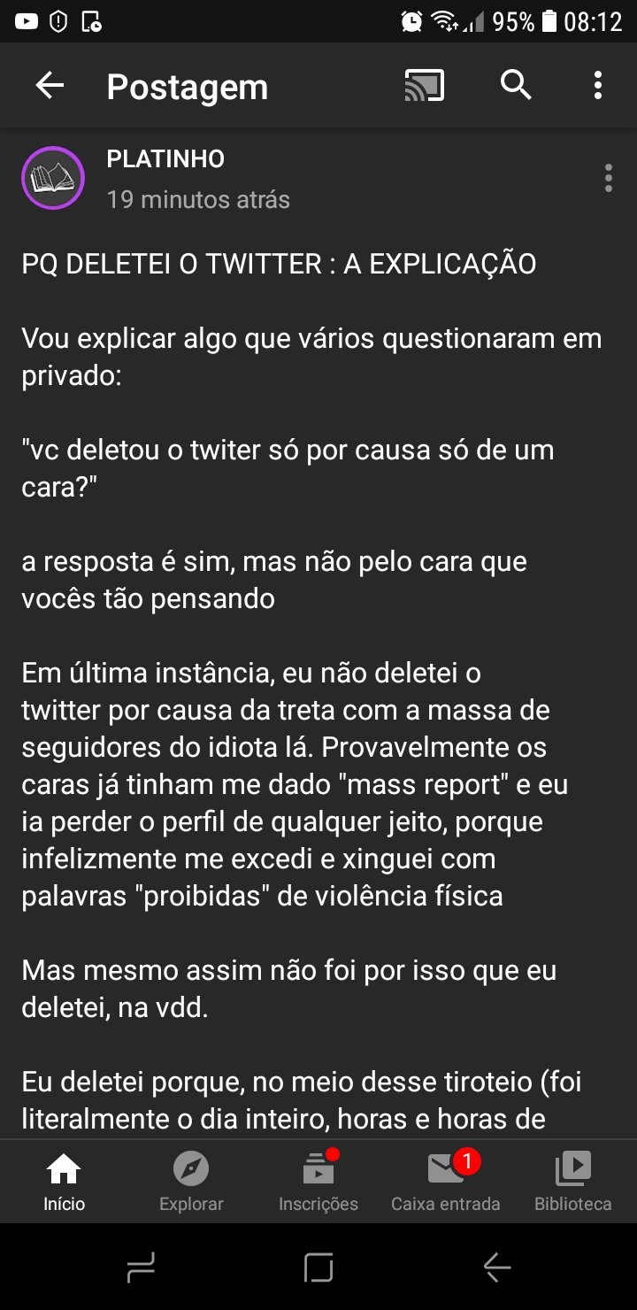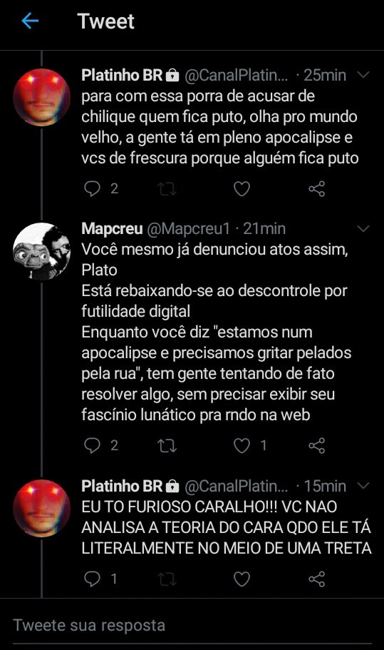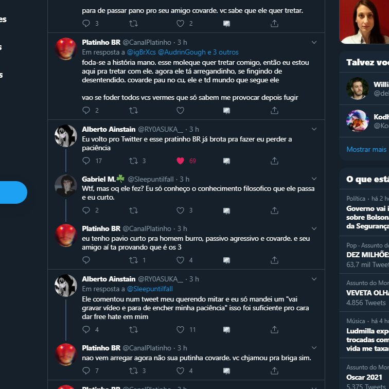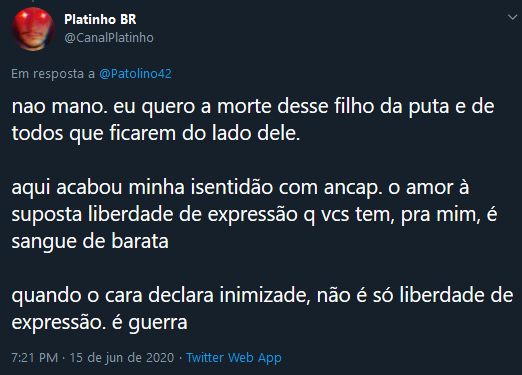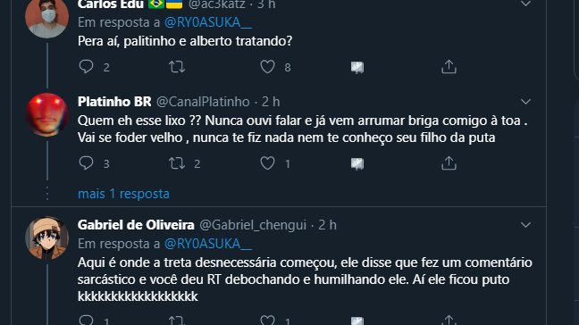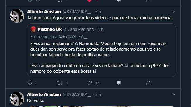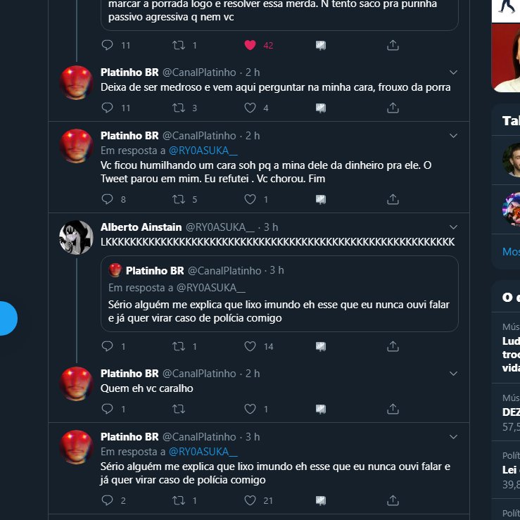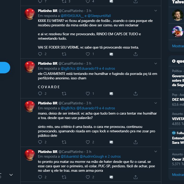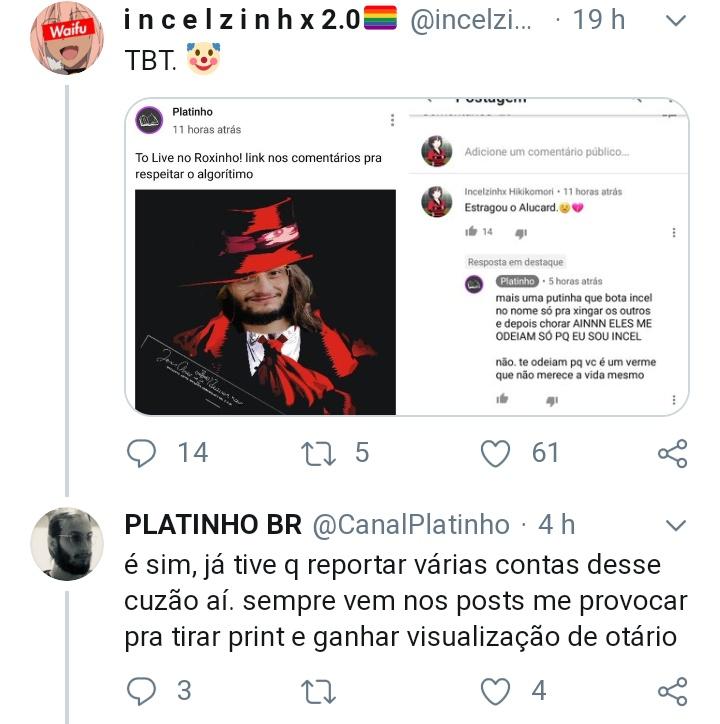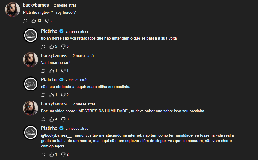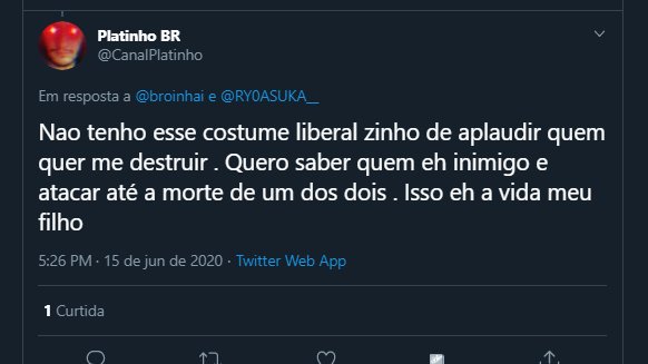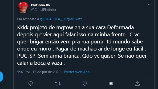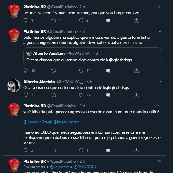 No dia seguinte Platinho posta um vídeo de meia hora criticando o cara com o qual começou a treta e querendo bancar de superior: