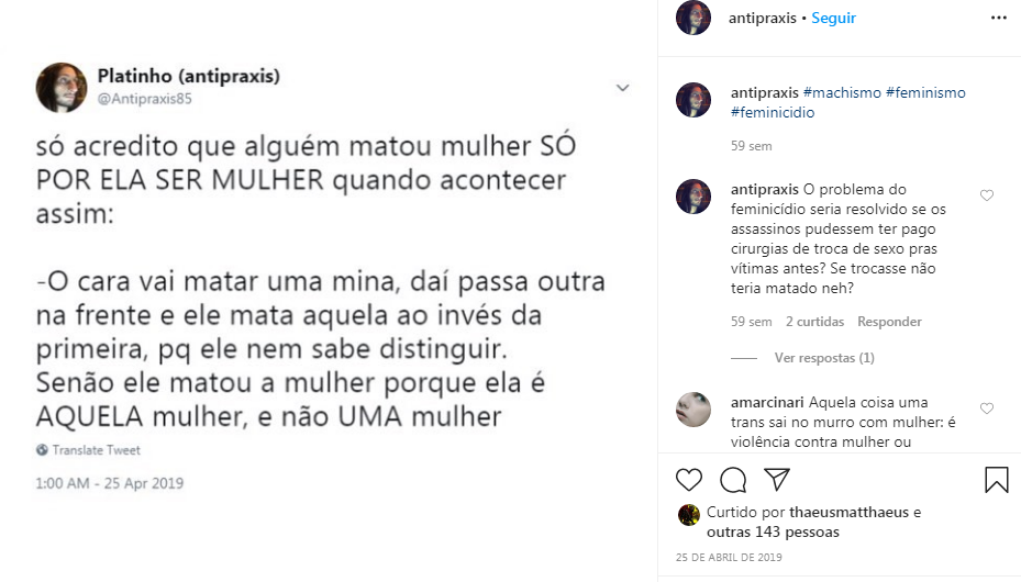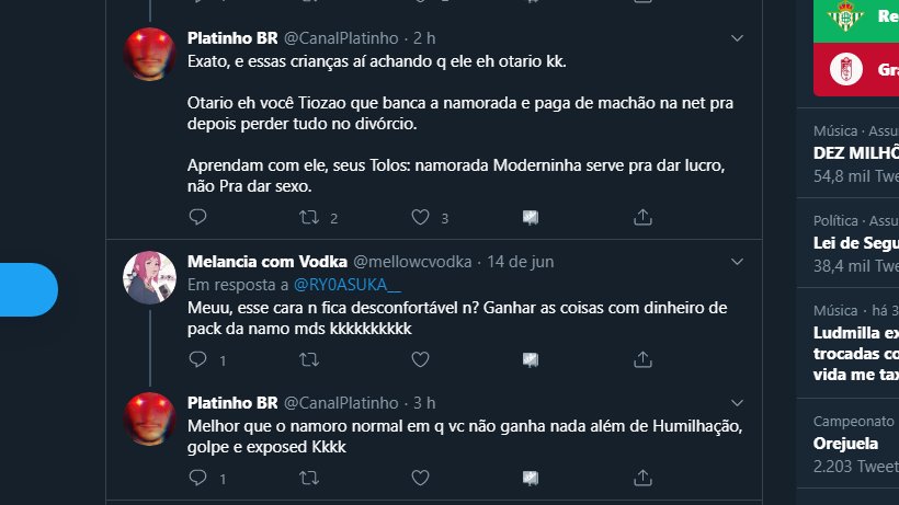 Platinho, todavia, garante que não endossa os comportamentos misóginos que os conteúdos de seus canais alimentam. “O sujeito chega até os vídeos com raiva por causa do que passa na vida e põe isso para fora nesse ambiente.” Na contenção de possíveis discursos de ódio, o youtuber recruta mulheres para moderar os comentários e evitar que as ofensas ao sexo feminino saiam do controle. Os assinantes costumam reclamar da providência.