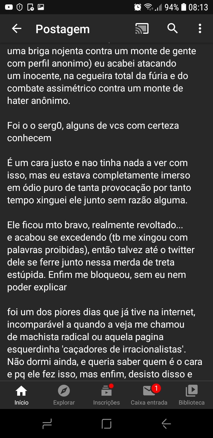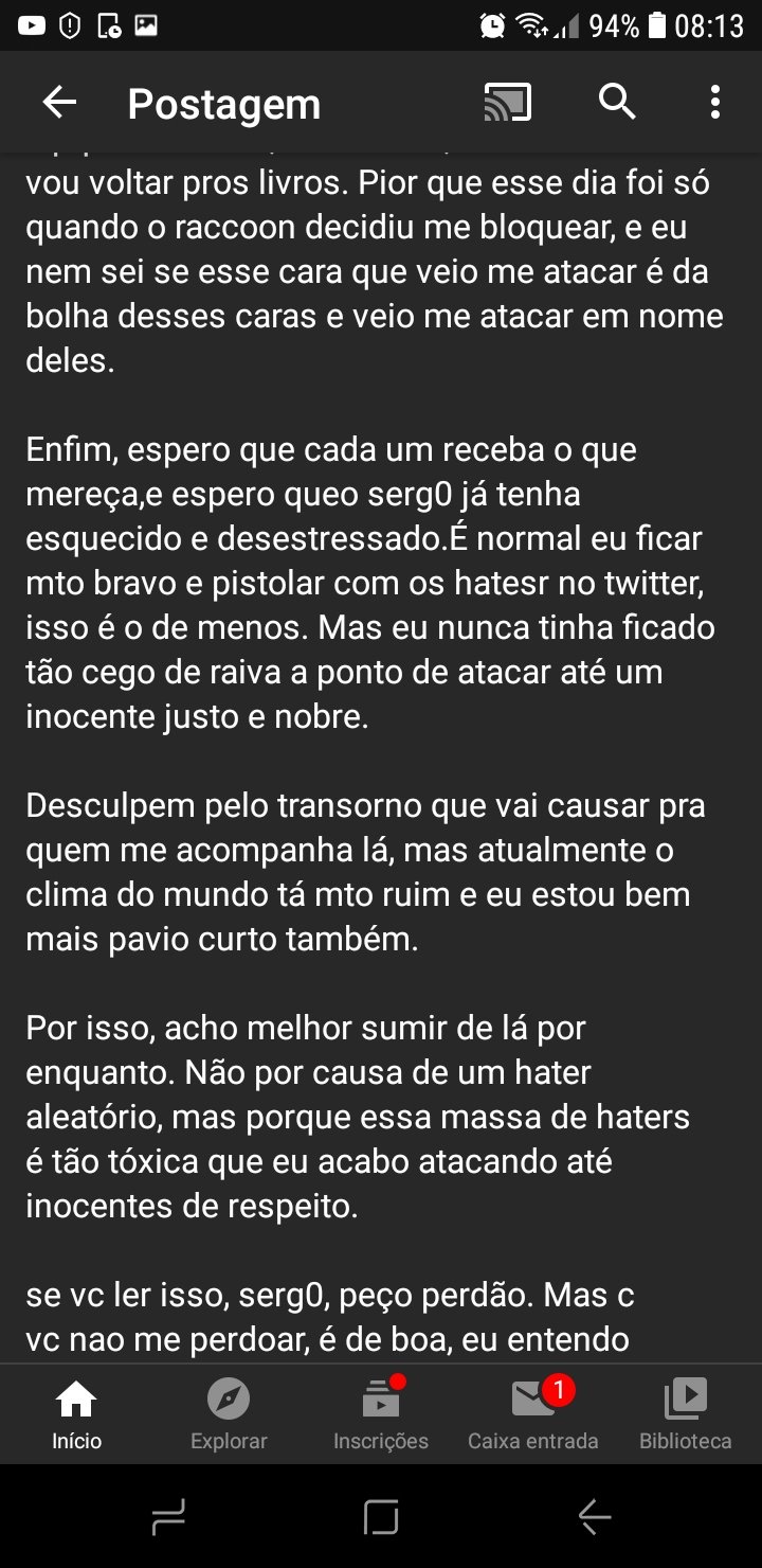 Recentemente acabou se explodindo por causa de um mal entendido e quis chamar todo mundo pro processo ou pra porrada,no fim se deu por vencido e acabou deletando o twitter, o episódio inteiro você confere a seguir: