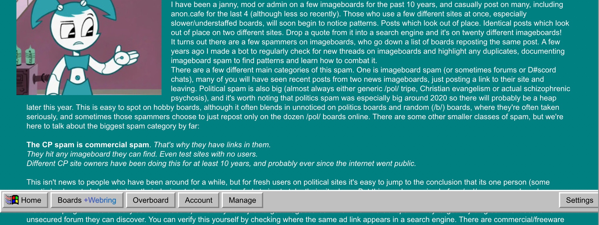 I’d like to read that thread, but 1. my ISP keeps blocking the site for some reason, and 2 the archive has this dumb taskbar concealing the text:I think this will will give you a better understanding on the CP bots.