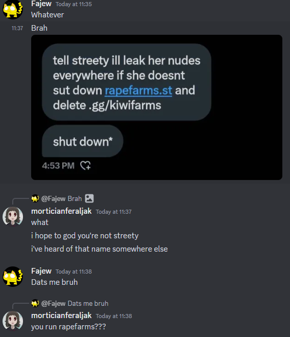 Rapefarms is run by Ewbound, a deeply disturbed, attention-seeking 15-year-old girl who constantly joins groomer Discord servers. Her alias on Rapefarms is streety, just like on Twitter: https://x.com/estonain