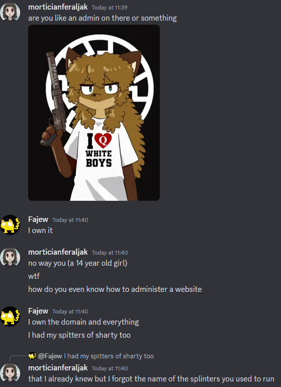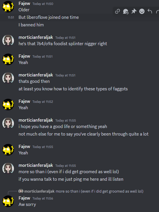 Yeah, I learned that I was really wrong about her recently. I was under the impression she used the Paul Morris meme just to piss this site off and that the site was being falsely targeted. Turns out she has multiple SFniggers and other weird foodists in a group she advertised in the Rape Niggers Telegram group (Uzbek Concentration Raping Camp). She even gave it a gay little MAP flag icon as seen below. I no longer have the link to it since I left but here's one of the very pleasant people I found while looking through it.Rapefarms is run by Ewbound, a deeply disturbed, attention-seeking 15-year-old girl who constantly joins groomer Discord servers. Her alias on Rapefarms is streety, just like on Twitter: https://x.com/estonain