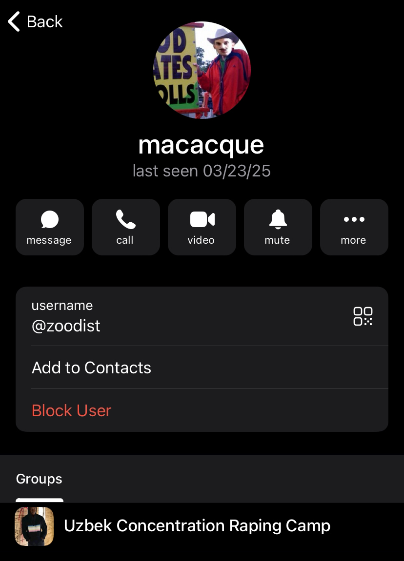 Call me a schizo, but if this individual is also the Terrycrews namefag from the sharty, that would be yuge.Yeah, I learned that I was really wrong about her recently. I was under the impression she used the Paul Morris meme just to piss this site off and that the site was being falsely targeted. Turns out she has multiple SFniggers and other weird foodists in a group she advertised in the Rape Niggers Telegram group (Uzbek Concentration Raping Camp). She even gave it a gay little MAP flag icon as seen below. I no longer have the link to it since I left but here's one of the very pleasant people I found while looking through it.
