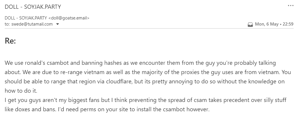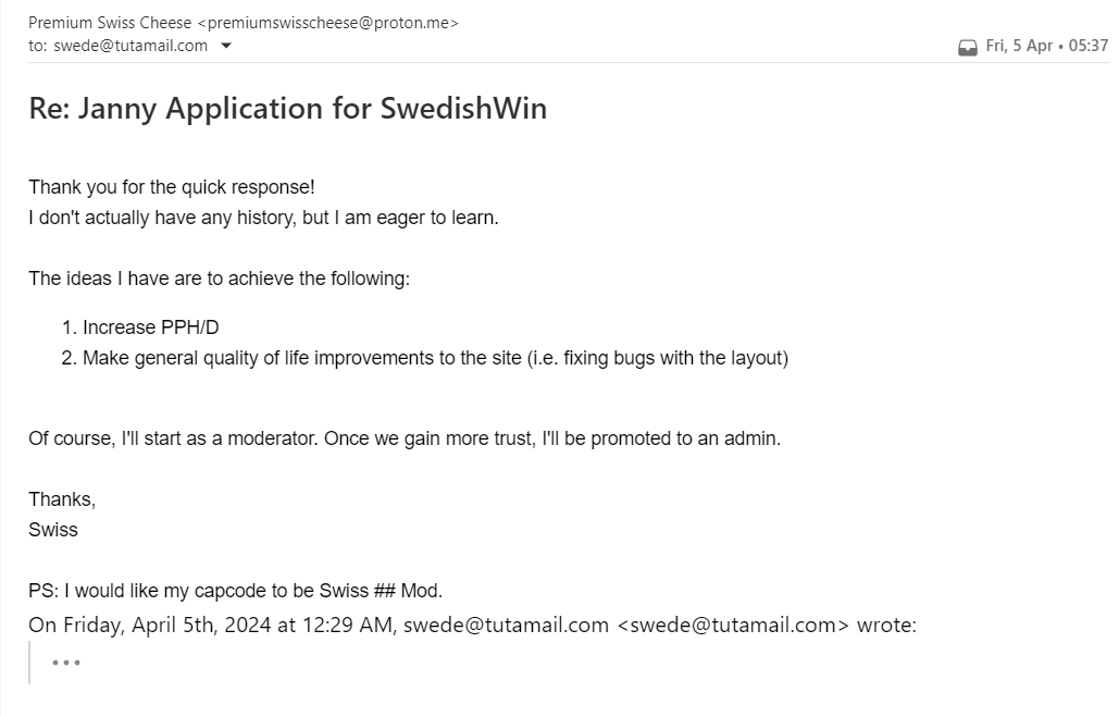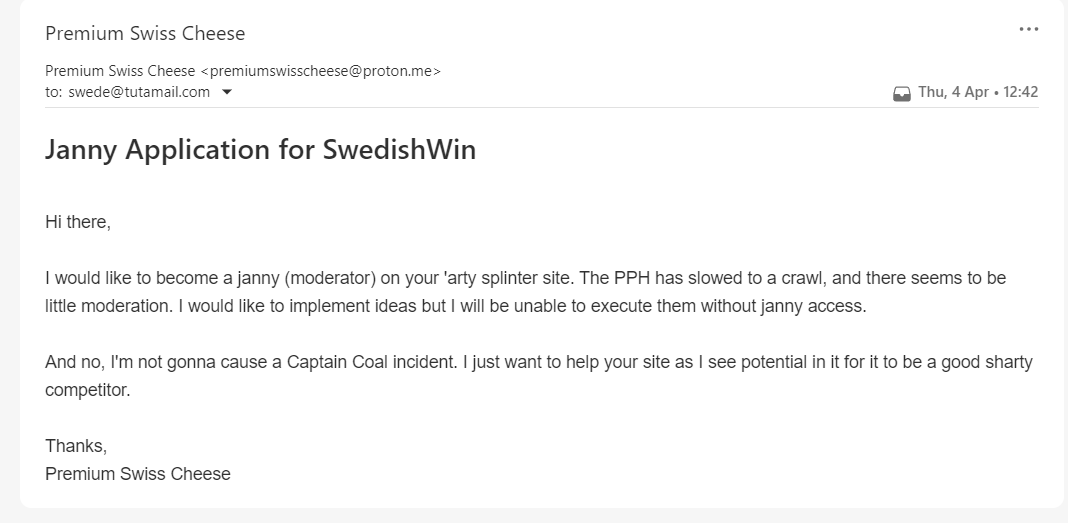 Just gotta set the record straight, that's the wrong email, the other admin that made this post likely got confused between them, here's the right ones:He was on VPN part of the time while captain coaling the site but used his real IP to log in several times(feraltranny moment). I rolled back the damage using the regular saves I make of the site and now I know his town as well as who sent this really obvious gayop janny application(picrel).