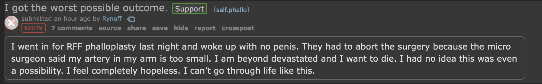 I went in for RFF phalloplasty last night and woke up with no penis. They had to abort the surgery because the micro surgeon said my artery in my arm is too small. I am beyond devastated and I want to die. I had no idea this was even a possibility. I feel completely hopeless. I can’t go through life like this.