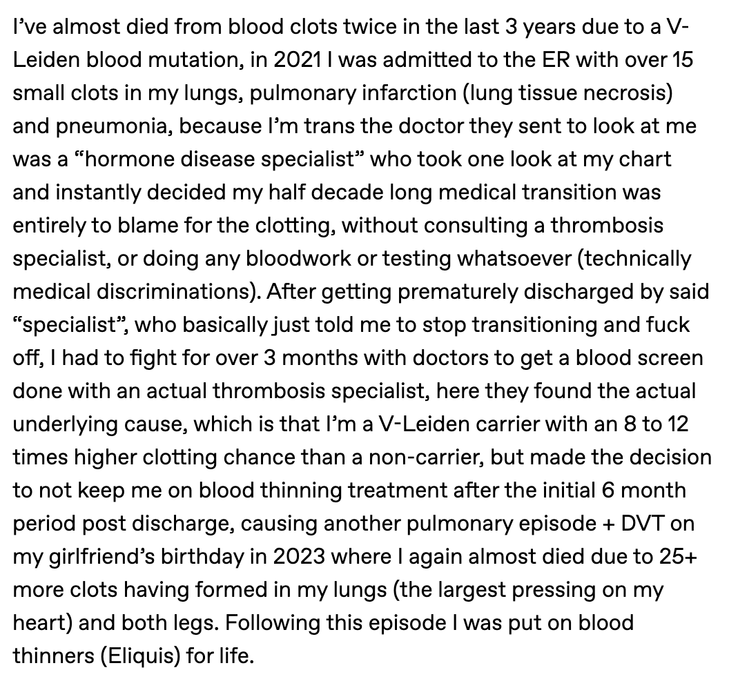 I’ve almost died from blood clots twice in the last 3 years due to a V-Leiden blood mutation, in 2021 I was admitted to the ER with over 15 small clots in my lungs, pulmonary infarction (lung tissue necrosis) and pneumonia, because I’m trans the doctor they sent to look at me was a “hormone disease specialist” who took one look at my chart and instantly decided my half decade long medical transition was entirely to blame for the clotting, without consulting a thrombosis specialist, or doing any bloodwork or testing whatsoever (technically medical discriminations). After getting prematurely discharged by said “specialist”, who basically just told me to stop transitioning and fuck off, I had to fight for over 3 months with doctors to get a blood screen done with an actual thrombosis specialist, here they found the actual underlying cause, which is that I’m a V-Leiden carrier with an 8 to 12 times higher clotting chance than a non-carrier, but made the decision to not keep me on blood thinning treatment after the initial 6 month period post discharge, causing another pulmonary episode + DVT on my girlfriend’s birthday in 2023 where I again almost died due to 25+ more clots having formed in my lungs (the largest pressing on my heart) and both legs. Following this episode I was put on blood thinners (Eliquis) for life.