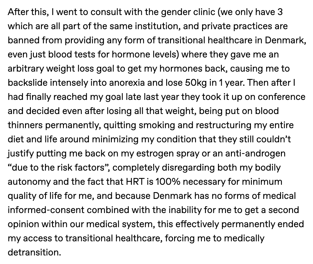 After this, I went to consult with the gender clinic (we only have 3 which are all part of the same institution, and private practices are banned from providing any form of transitional healthcare in Denmark, even just blood tests for hormone levels) where they gave me an arbitrary weight loss goal to get my hormones back, causing me to backslide intensely into anorexia and lose 50kg in 1 year. Then after I had finally reached my goal late last year they took it up on conference and decided even after losing all that weight, being put on blood thinners permanently, quitting smoking and restructuring my entire diet and life around minimizing my condition that they still couldn’t justify putting me back on my estrogen spray or an anti-androgen “due to the risk factors”, completely disregarding both my bodily autonomy and the fact that HRT is 100% necessary for minimum quality of life for me, and because Denmark has no forms of medical informed-consent combined with the inability for me to get a second opinion within our medical system, this effectively permanently ended my access to transitional healthcare, forcing me to medically detransition.