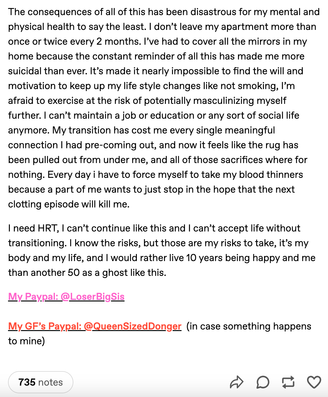 The consequences of all of this has been disastrous for my mental and physical health to say the least. I don’t leave my apartment more than once or twice every 2 months. I’ve had to cover all the mirrors in my home because the constant reminder of all this has made me more suicidal than ever. It’s made it nearly impossible to find the will and motivation to keep up my life style changes like not smoking, I’m afraid to exercise at the risk of potentially masculinizing myself further. I can’t maintain a job or education or any sort of social life anymore. My transition has cost me every single meaningful connection I had pre-coming out, and now it feels like the rug has been pulled out from under me, and all of those sacrifices where for nothing. Every day i have to force myself to take my blood thinners because a part of me wants to just stop in the hope that the next clotting episode will kill me.