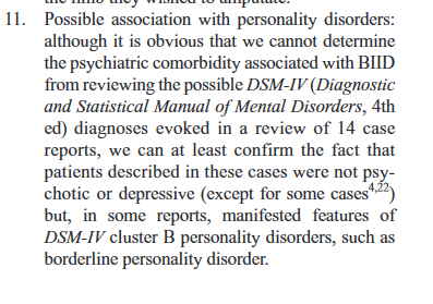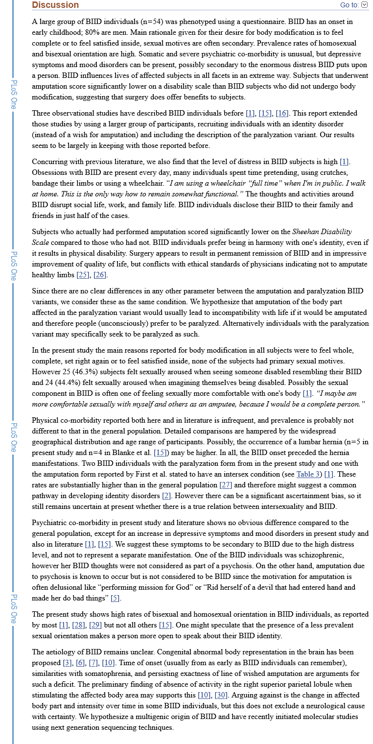 So, because Body Integrity Identity Disorder is often brought up here, mainly to show how society draws the line of amputating your limbs, but not for chopping off healthy breasts and genitals, I decided to look more into it, and to see if it really does compare to gender dysphoria.