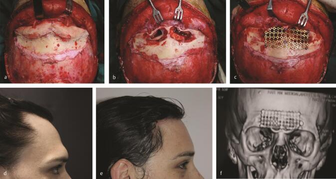e ) Outer table being put back in place after contouring and reduction of nasion. (