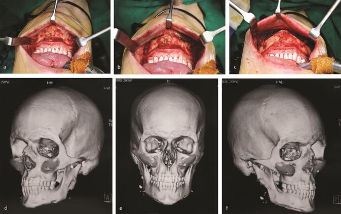 f ) Fixation using 1.3-mm titanium plates and 3-mm self-drilling titanium screws. (