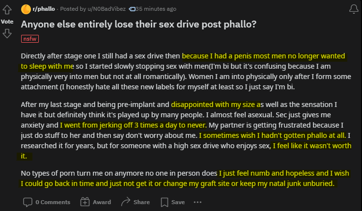Silly troon, hanging to one side is the authentic male experience.u/Montage24. 8 weeks post-op alt 3.5 weeks post skin graft. previous mention