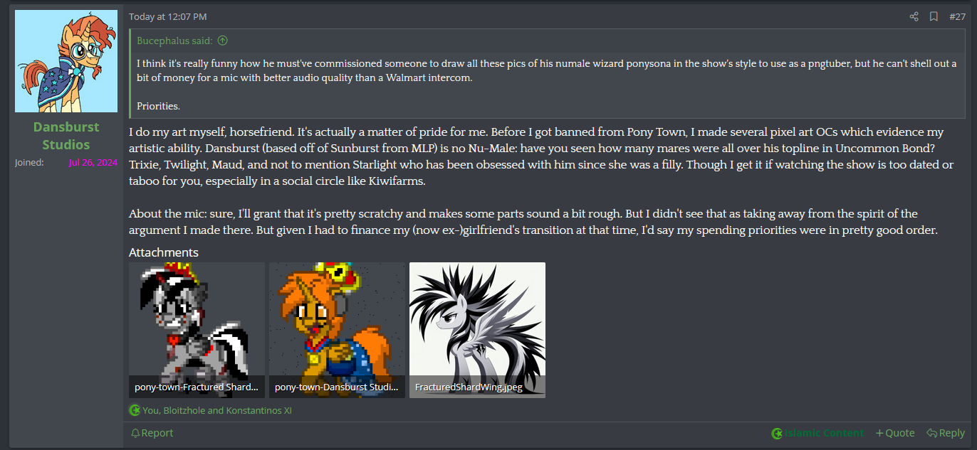 So the idiot who preached hypermasculinity on the gaming board, routinely made a show of leaving threads in a huff, and eventually got so skeeved he left the forum turned out to be a digimon autist. Glad I penned him as a faggot. Guy could not take any banter at all.