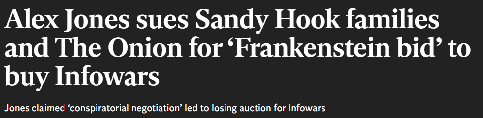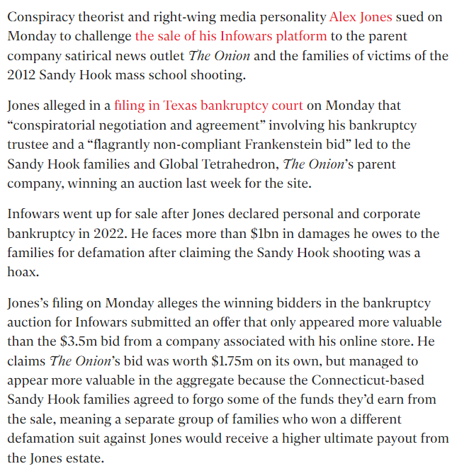They outright said in court they want to earn everything he makes and wants to shut down anyone that works with him so he can no longer sell products. They wish to strip him of his freespeech, look at who owns and funds The Onion and their "bid" it is a newly named group of anti-gun activists that want him dead. As I said in a previous post, he's been nothing but supportive of the families and reached settlements before these people bulldozed in and tried to get him stopped. This whole thing is a disaster anyway because the only thing he did was on a broadcast read out internet articles claim it was a hoax.