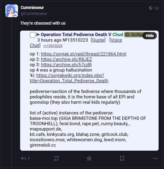 By late August I decided to have myself a small hiatus and just think. I had too much at once and already felt like I was losing. The main thing I was trying to establish for myself was how deep it all goes. Could I still cut it off? Nnia was about 3 instance hops removed from people who doxxed teenagers and sent them torture porn. And people completely innocently were making these instance hops, just because they wanted friends, other perspectives, or had idle curiosity.