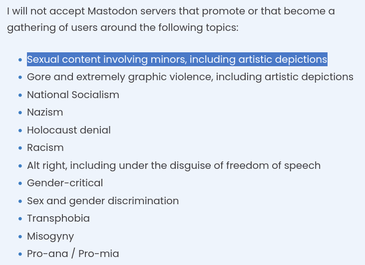 Around the same time I found out that the CSEM instance owner that doxxed a teen now co runs a new instance. They were also allowed to register on another as a user. I did not succeed in persuading anyone that it was a problem. It seems like, by the middle of summer, other fedi admins started seeing the debate around CSEM and abuse as yet one more annoying discourse topic. Later I was even invited by one of them in an art related chat where that same CSEM admin was.