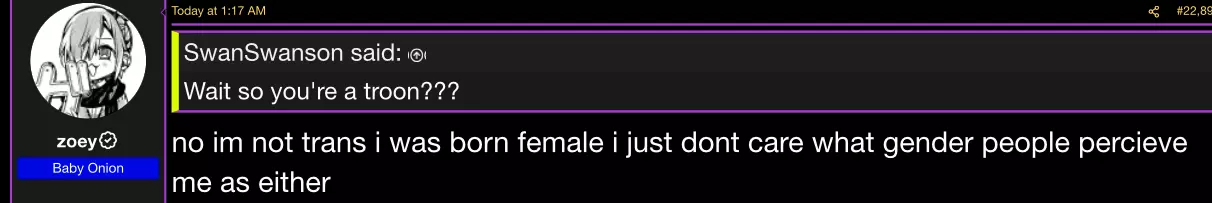 I was about to say her gender is "Z" but then I remembered those animal fuckers took that letter already.This hasn't been posted but Zoey just admit that she is a TRUE & HONEST Biological Female after a year of identifying herself as male.