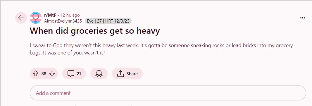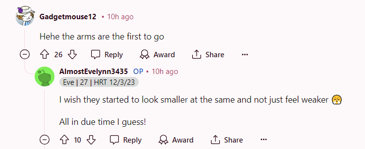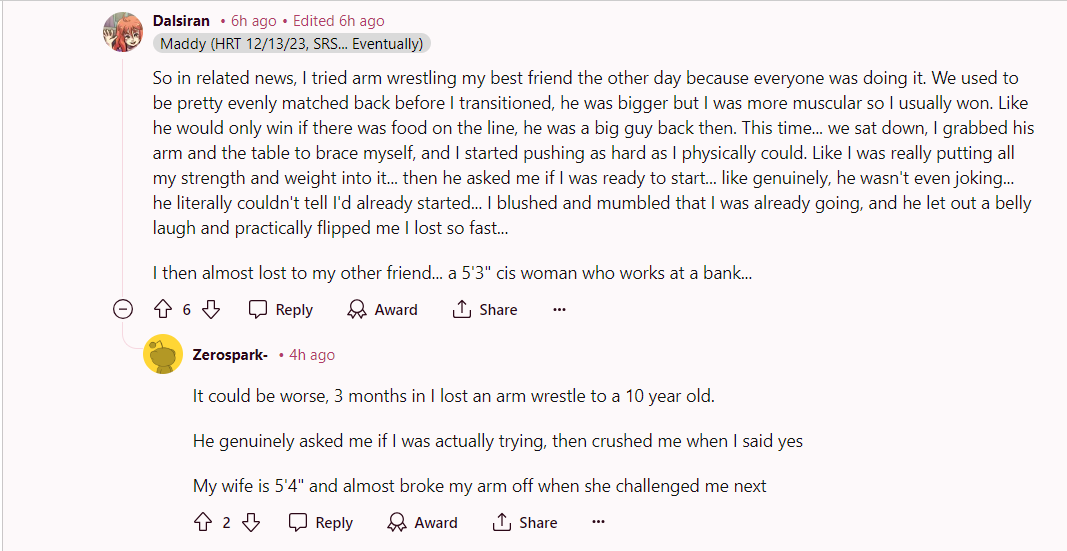 'I'm so weak now like a little girly...tee hee'...these idiots, if they are telling the truth which I doubt, are they not worried about what they are doing to their health, weakness like this cannot be induced with a few months of hormones.So we have a guy that began taking HRT in march 12
