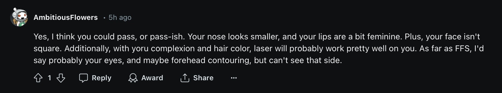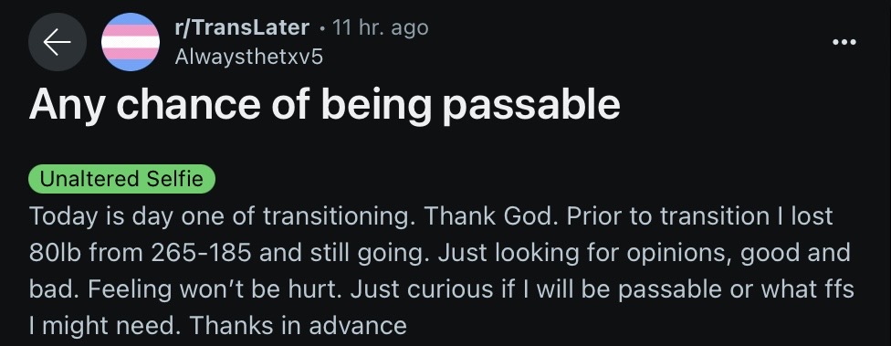 They are such blatant liars...man needs to hear 'no, you won't pass, none of us do you know?, it's just a load of delusional nonsense cooked up by weak twats who can't face reality, this is a one way path to isolation and despair and we all just pretend it's not cause misery loves company'.All I see here is another man failed by society, trooning out being so accepted and encouraged claims another totally ordinary looking guy who probably just needed some talking to.