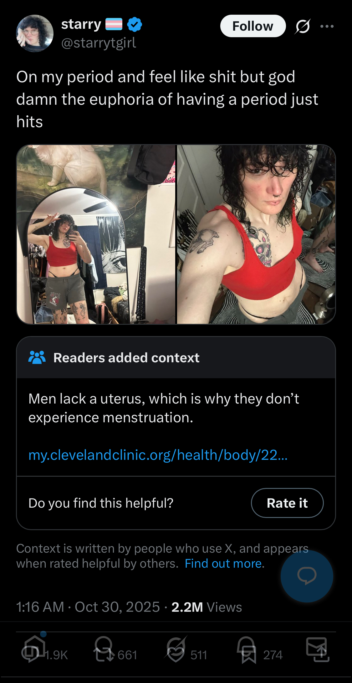 Soemone should inform him that a hiked up thong is not to be worn on a period. Neither are way too small, tight elastic shorts cutting into your swollen gut because that *would* be agony if he *were* a woman on a period.